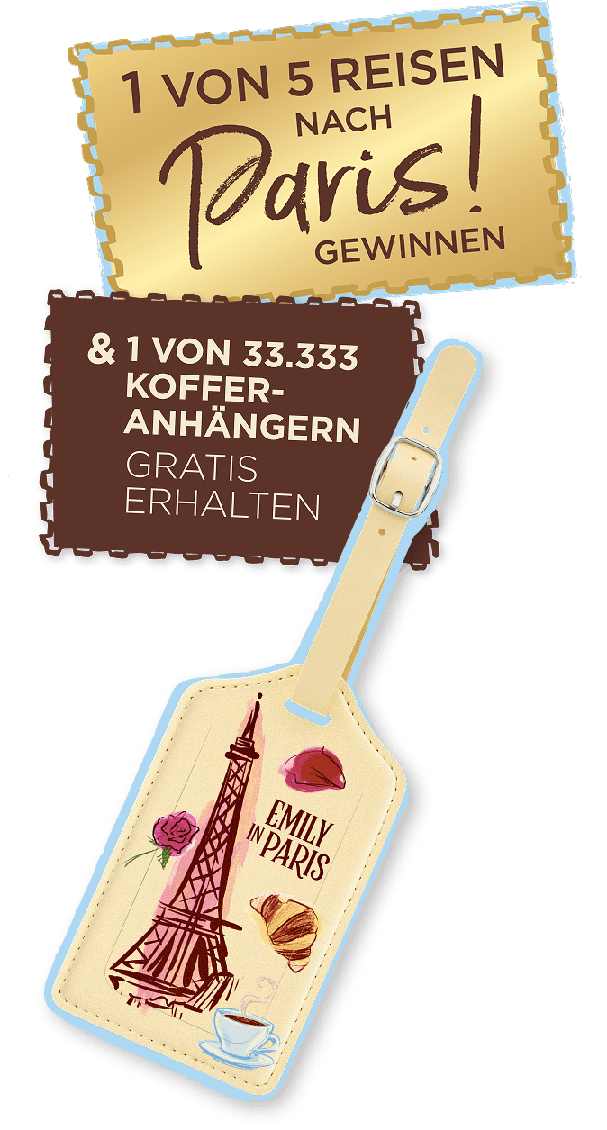 Beim Kauf einer Aktionspackung im „Emily in Paris“-Design der teilnehmenden Marken Ferrero Rocher, Mon Chéri oder Die Besten, kannst du an einem exklusiven Gewinnspiel teilnehmen. Dabei hast du die Chance auf 1 von 5 Reisegutscheinen für eine Reise nach Paris im Wert von je 1.500 € und bekommst, mit deiner Zustimmung und nach Hochladen eines gültigen Kassenbon-Fotos, garantiert 1 von 33.333 Kofferanhängern im „Emily in Paris“-Design gratis zu dir nach Hause geschickt (solange der Vorrat reicht).